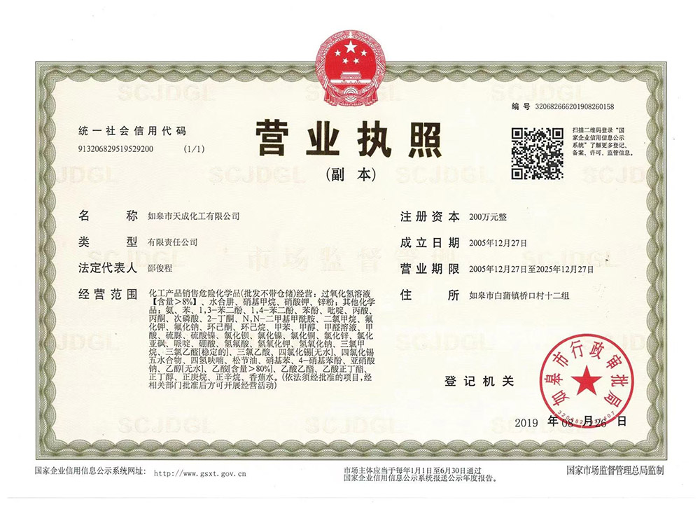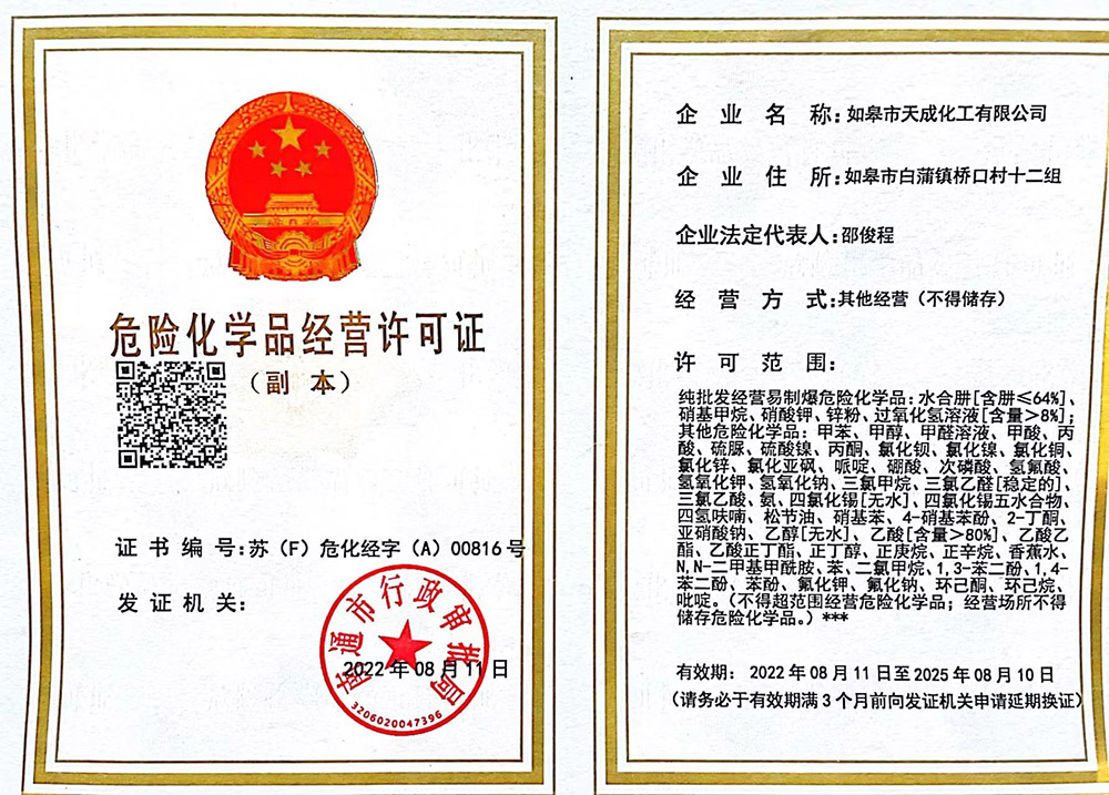 ? 如皋市天成化工有限公司創建于1996年。公司地處于美麗富饒的長江三角洲,座落在古鎮林梓,通揚運河河畔。南瀕長江、西臨204國道,距南通港、飛機場30公里,立體交通發達。公司經營管理規范,技術力量雄厚,擁有一批高、中級專業技術人才。